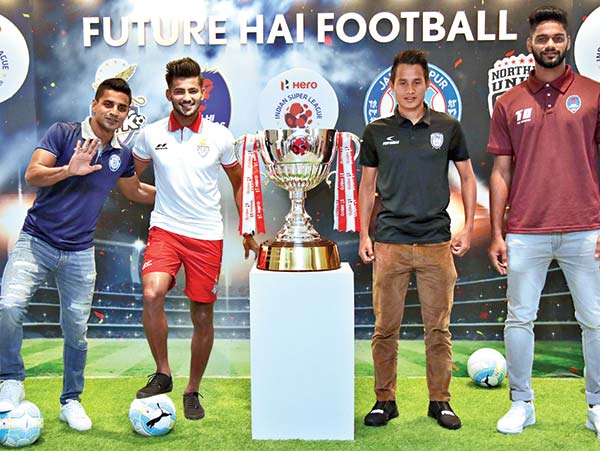 তারকা: আইএসএলের চার দলের চার ফুটবলার। বাঁ দিক থেকে মেহতাব, জয়েশ রানে, লালরেমপুইয়া ফানাই ও অ্যালবিনো গোমস। —নিজস্ব চিত্র।