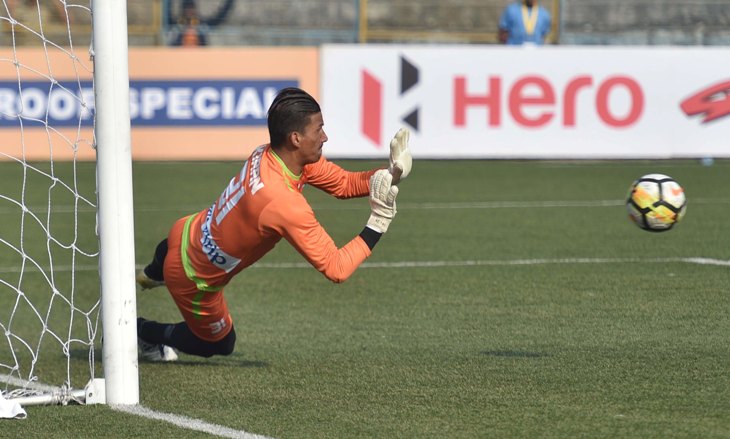 এই ভাবেই কাতসুমির পেনাল্টি বাঁচালেন মিনার্ভা পঞ্জাবের গোলরক্ষক। ছবি: সুদীপ্ত ভৌমিক।