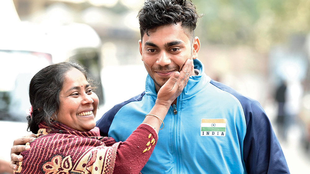 মমত্ব: অচিন্ত্যকে সান্ত্বনা দিচ্ছেন তাঁর মা। মঙ্গলবার। নিজস্ব চিত্র