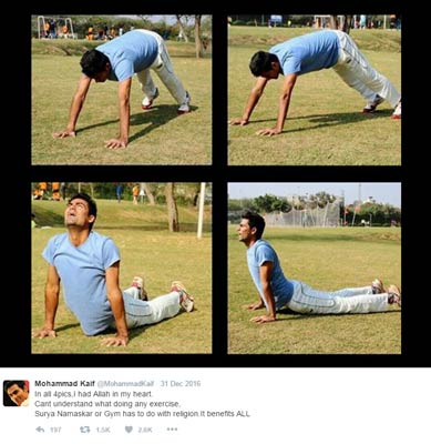 করিনা কপূর ও সইফ আলি খান, মহম্মদ শামির পর এ বার মৌলবাদের শিকার ক্রিকেটার মহম্মদ কাইফ। টুইটারে সূর্য নমস্কার করার ছবি পোস্ট করে তীব্র সমালোচনার মুখে পড়েলেন ন্যাটওয়েস্ট ফাইনালের হিরো। গত ৩১ ডিসেম্বর সূর্য নমস্কাররত ছবি পোস্ট হওয়ার সঙ্গে সঙ্গে টুইটারে কাইফের বিরুদ্ধে বিদ্বেষমূলক মন্তব্যের ঝড় ওঠে।