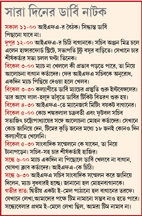 প্রবীর দাস, অর্ণব দাসশর্মা, তপন মাইতিরাও যে এই ম্যাচেই নিজেদের জাত চেনানোর জন্য মরিয়া হয়েছিলেন। সে ভাবে মানসিক ভাবে প্রস্তুতিও নিয়ে ফেলেছিলেন। কিন্তু মঙ্গলবার সন্ধেয় মোহনবাগান কর্তাদের ডার্বি না খেলার চূড়ান্ত সিদ্ধান্তে ডাফি, প্রবীর, বিদেমিদের স্বপ্নগুলো ভেঙ্গে গুড়িয়ে গেল। কর্তাদের নির্দেশে বাগান ফুটবলাররা মুখে কুলুপ এঁটেছেন ঠিকই। কিন্তু তাঁদের চোখেমুখে হতাশার রেখাগুলো বড় স্পষ্ট হয়ে ধরা পড়ল।