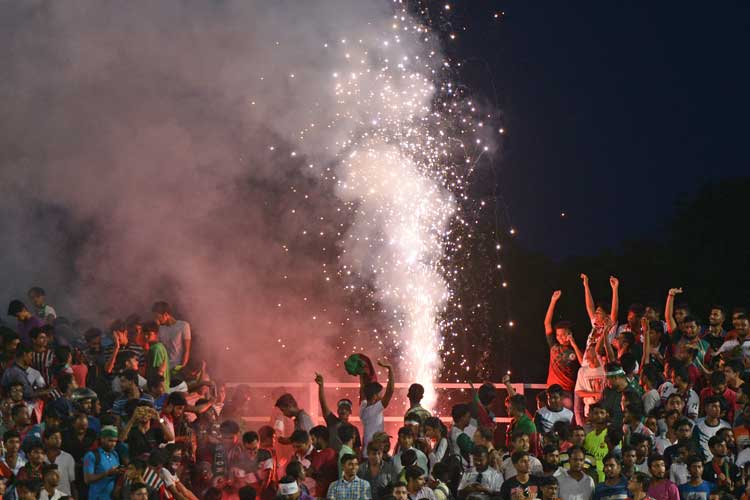 দিনের আলো পড়তেই পুরো মোহনবাগান গ্যালারিতে জ্বলে উঠল মোবাইল ফোনের টর্চ। যেন ঘুরে বেড়াচ্ছে জোনাকি। তার আগে থেকেই মাতছিলেন তাঁরা। আবির, ফানুস উড়ল মোহনাগানের আকাশে। তার মধ্যেই লিগ জয়ের লক্ষ্যে লড়াই চলল মোহনবাগান ফুটবলারদের। কোচ হিসেবে প্রথম সাফল্য তুলে নিলেন শঙ্করলাল চক্রবর্তী।