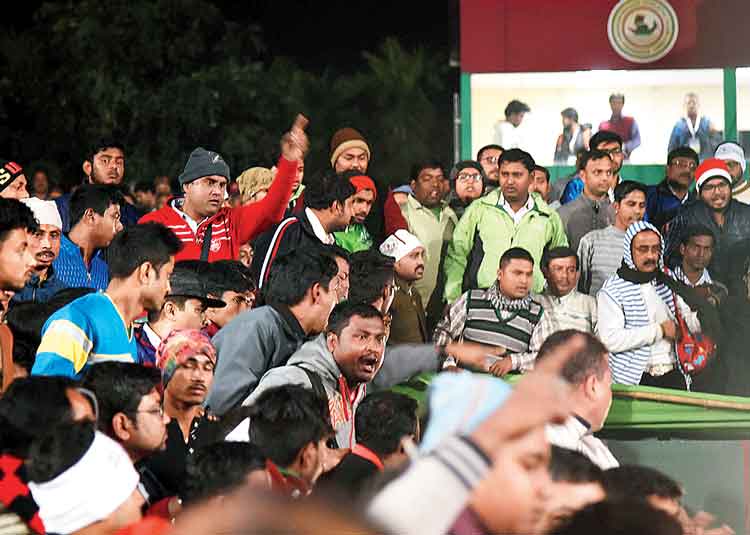হারের দায় মাথায় নিয়ে যখন সঞ্জয় সেন হাতে মাইক্রোফোন নিয়ে বলছেন, ‘‘আমি আর মোহনবাগানের কোচ থাকছি না। সব দায় নিয়ে পদত্যাগ করছি।’’ তখনও চলছে একই রকম অভব্যতা।