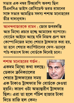 টিএনসিএ ভাইস প্রেসিডেন্ট রামন তামিলনাড়ুর প্রাক্তন অ্যাডভোকেট জেনারেল ছিলেন। তিনি এ দিন আনন্দবাজারকে বললেন, ‘‘জোর জবরদস্তি আর মিথ্যে প্রচার হচ্ছে আমাদের ব্যাপারে। বোর্ডের আইনে আছে যদি নিজস্ব গ্রুপ অব কোম্পানিজের মধ্যে শেয়ার ট্রান্সফার করা হয়, তা হলে শেয়ার ক্যাপিটালের ফেস-ভ্যালুর পাঁচ শতাংশ টাকা বোর্ডকে দিলেই চলে।’’ রামন দাবি করলেন, ‘‘সিএসকের শেয়ার ক্যাপিটালের ফেস-ভ্যালু হল পাঁচ লক্ষ টাকা। সিএসকের বিক্রয়মূল্য কোন দুঃখে পাঁচ লাখ হতে যাবে? আমরা তেমন কথা বলিইনি। মিডিয়া না বুঝেই অনর্থক এটা নিয়ে হইচই করছে। এর আগে ডেকান ক্রনিক্যালও একই পদ্ধতিতে মালিকানা ট্রান্সফার করেছিল। সেটা যদি অবৈধ না হয়, তা হলে এটা কেন?’’ যা শুনে রাতে আবার গর্জে উঠলেন শশাঙ্ক মনোহর। বললেন, ‘‘একদম মিথ্যে কথা বলছে। ডেকান ক্রনিক্যালের শেয়ার ট্রান্সফারের সময় এক টাকাও ট্রান্সফার ফি বোর্ডকে দেওয়া হয়নি। কারণ ওটা অভ্যন্তরীণ ট্রান্সফার ছিল। এরা তা হলে পঁচিশ হাজার টাকা দিতে রাজি হল কেন?’’ শশাঙ্কের দ্বিতীয় প্রশ্ন, ‘‘যদি শেয়ার নিজের গোষ্ঠীর মধ্যেই ট্রান্সফার করে, তা হলে সুপ্রিম কোর্ট যে রায় দিয়েছিল শ্রীনিকে কনফ্লিক্ট অব ইন্টারেস্ট থেকে বেরিয়ে আসতে হবে, সেটা আর হল কোথায়? এ তো শ্রীনির শেয়ার শ্রীনির কাছেই থাকল।’’
