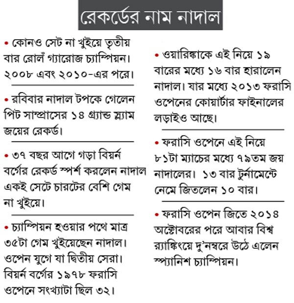কেরিয়ারের ২২তম গ্র্যান্ড স্ল্যাম ফাইনাল খেলতে নেমে কোনও সেট না খুইয়ে এই নিয়ে তৃতীয় বার জিতলেন তিনি। গোটা টুর্নামেন্ট জুড়েই স্প্যানিশ মহাতারকা যে দাপট দেখিয়েছিলেন সেটা বজায় ছিল ফাইনালে সুইস প্রতিদ্বন্দ্বীর বিরুদ্ধেও। টুর্নামেন্ট জুড়ে মাত্র ৩৫টা গেম হারিয়েছেন নাদাল। ফাইনালে সংখ্যাটা ৬। ২০০৮-এ ফরাসি ওপেনের ফাইনালে রজার ফেডেরারের বিরুদ্ধে মাত্র চারটে গেম হারিয়ে চ্যাম্পিয়ন হওয়ার নজির গড়ার পরে তাঁর এ রকম দাপট বহুদিন দেখা যায়নি। অবশ্য গ্র্যান্ড স্ল্যামে দাপট দেখানোর দিক থেকে হয়তো এ বারের ফরাসি ওপেন সবচেয়ে এগিয়ে থাকবে না। তবে দু’নম্বরে থাকতেই পারে। ১৯৭৮ ফরাসি ওপেনের পরে। যে বার বিয়র্ন বর্গ চ্যাম্পিয়ন হওয়ার পথে গেম হারিয়েছিলেন ৩২টি।