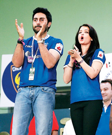 সব খেলার সেরা...। আটলেটিকো দে কলকাতা ও চেন্নাইয়ান এফসির খেলায় গ্যালারিতে অভিষেক-ঐশ্বর্যা। মঙ্গলবার চেন্নাইয়ে। ছবি: পিটিআই
