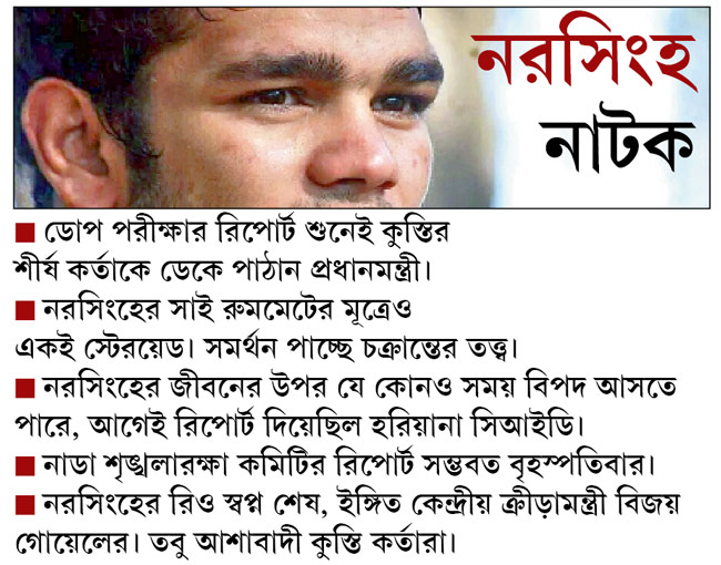 কেন্দ্রীয় ক্রীড়ামন্ত্রী বিজয় গোয়েল আবার এক রকম জানিয়েই দিয়েছেন, নাডা-র শৃঙ্খলারক্ষা প্যানেলে যা-ই হোক, ৭৪ কিলো বিভাগে নরসিংহের রিও স্বপ্ন শেষ। বলেছেন, ‘‘ওর ‘এ’ এবং ‘বি’ দুই নমুনাই পজিটিভ, সেটা মনে রাখতে হবে। নাডার আইনের আওতায় শৃঙ্খলারক্ষা প্যানেল যা ঠিক করার করবে। এই মামলায় তার চেয়ে বেশি কিছু করা আমাদের পক্ষে সম্ভব নয়।’’