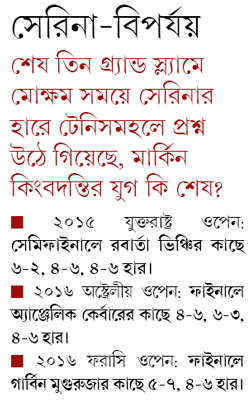 আমার বরং মনে হচ্ছে, ভাবীকাল সেরিনাকে সেরার পাশাপাশি সেরা চোকার্সও বলবে। মনে করে দেখুন, ইউএস ওপেন সেমিফাইনালে এক সেট এগিয়েও শেষমেশ হেরেছে রবার্তা ভিঞ্চির কাছে। অস্ট্রেলীয় ওপেন ফাইনালে দ্বিতীয় সেট জিতে সমতা ফিরিয়েও চূড়ান্ত সেটে পারেনি কের্বারের বিরুদ্ধে। এ দিন রোলাঁ গারোয় প্রথম সেটে ‘ব্রেক ব্যাক’ করে ৫-৫ এসেও দু’টো গেম পরেই ফের নিজের সার্ভিস নষ্ট করে ৫-৭ হেরে বসল। এমনকী দ্বিতীয় সেটের গোড়ায় সেই যে সার্ভিস গেম হারাল আর উঠে দাঁড়াতে পারল না। হারল ৫-৭, ৪-৬। এগুলো চোকিং নয়তো কী!