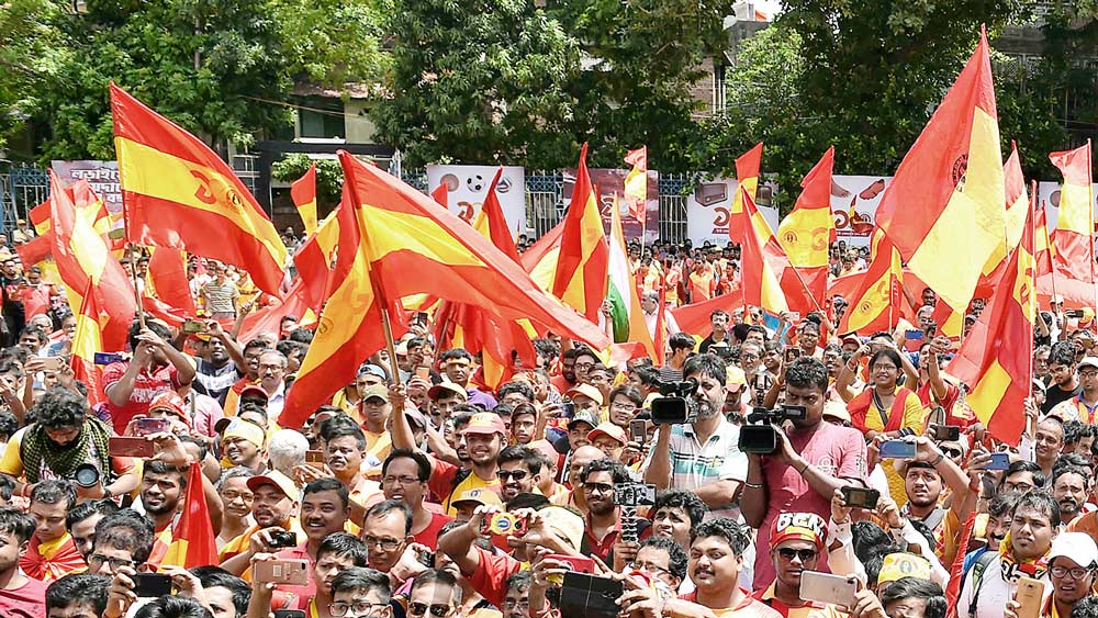 আবেগ: অসংখ্য লাল-হলুদ ভক্ত ক্লাবের শতবর্ষে এ ভাবেই আনন্দস্রোতে ভাসতে চলেছেন। নতুন লগ্নিকারী আসা নিশ্চিত, দেশের সর্বোচ্চ লিগে খেলার পথে ইস্টবেঙ্গল। আইএসএলে ঐতিহ্যের ইস্টবেঙ্গল-মোহনবাগান ডার্বিও থাকছে। ফাইল চিত্র