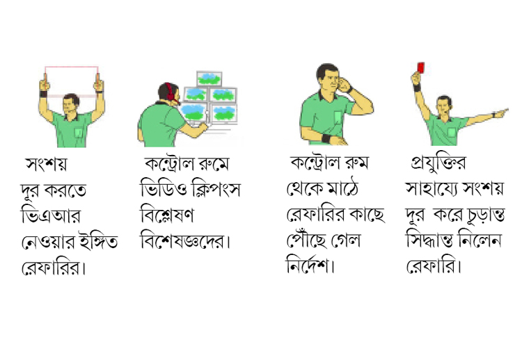 এক) ম্যাচের মধ্যে কোনও সিদ্ধান্ত নেওয়ার ক্ষেত্রে সংশয় থাকলে রেফারি ভিএআর-এর সাহায্য নিতে পারেন। আবার কন্ট্রোল রুমে টিভিতে নজর রাখা বিশেষজ্ঞরাও রেফারির সঙ্গে যোগাযোগ করতে পারেন। দুই) কন্ট্রোল রুমে বসে থাকা বিশেষজ্ঞরা রেফারিকে জানান ভিডিও ফুটেজে কী রয়েছে। পরামর্শ দেওয়া হয় রেফারিকে। তিন) ভিএআর-এর পরামর্শ অনুযায়ী সিদ্ধান্ত নিতে পারেন রেফারি। না হলে সাইড লাইনের ধারে রাখা মনিটরে তিনি নিজেই রিপ্লে দেখে সিদ্ধান্ত নিতে পারেন।
