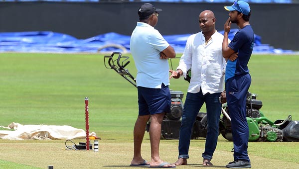 ক্যান্ডির মাঠে আলোচনায় ব্যস্ত শ্রীলঙ্কার অধিনায়ক চান্দিমাল, নির্বাচক জয়সূর্য। ছবি: এএফপি।