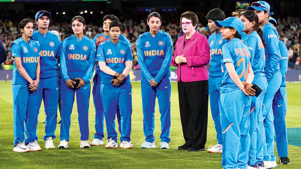 বিষণ্ণ: বিশ্বকাপ ফাইনালে হারের পরে ভারত। স্মৃতিদের সঙ্গে টেনিস কিংবদন্তি বিিল জিন কিং। রবিবার। ছবি: রয়টার্স।