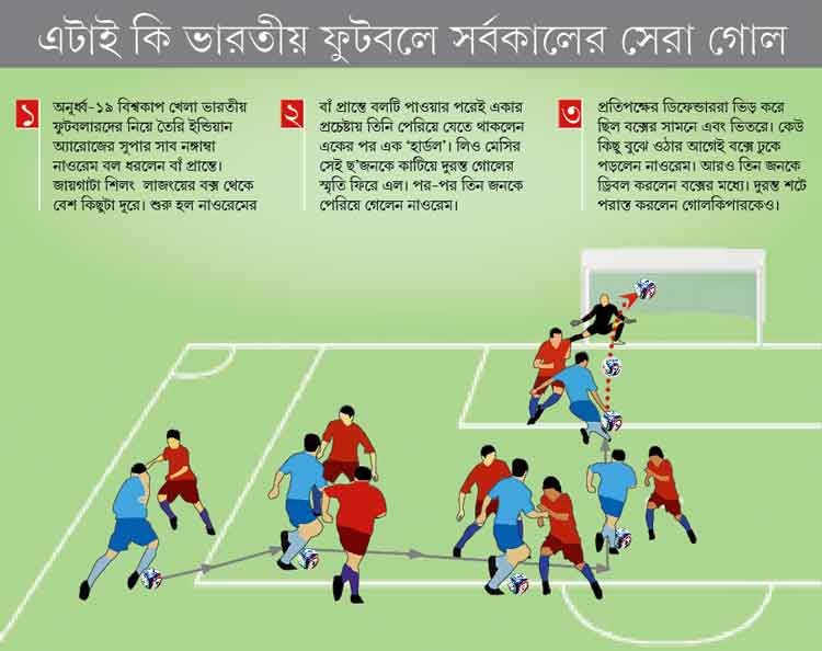 যাকে নিয়ে দেশজুড়ে এত হইচই সেই নাওরেম অবশ্য ভারতীয় ফুটবলের ইতিহাসে অন্যতম সেরা কীর্তি করার পরে নিজেই অবাক। মিক্সড জোনে দাঁড়িয়ে বিস্মিত ভাবে বলে দিয়েছেন, ‘‘আমি স্বপ্নেও ভাবিনি এ রকম গোল করতে পারি। তবে মাতোস স্যার আমাকে ড্রিবলের সঙ্গে গোলও করতে বলতেন।’’ ইন্ডিয়ান অ্যারোজের কোচ লুইস নর্টন দে মাতোস এ দিন রিজার্ভ বেঞ্চে ছিলেন না। বড়দিনের ছুটি কাটাতে দেশে গিয়েছেন তিনি। থাকলে ক্রিশ্চিয়ানো রোনাল্ডোর দেশের মাতোস দেখতে পেতেন, কী ভাবে বিপক্ষের ছয় জন ফুটবলারকে ড্রিবল করতে করতে গোল করেছে তাঁর ছাত্র।