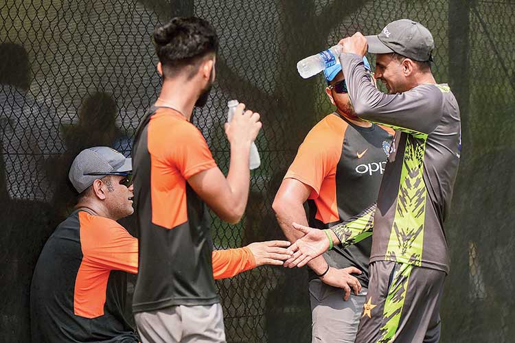 শুক্রবার দুবাইয়ে আইসিসি ইন্টারন্যাশনাল ক্রিকেট সিটিতে দুই দলের অনুশীলন চলছিল পাশাপাশি নেটে। হঠাৎ নিজেদের নেট থেকে ভারতের নেটের দিকে ছুটে আসেন প্রাক্তন অধিনায়ক শোয়েব মালিক। মহেন্দ্র সিংহ ধোনির সঙ্গে হাত মেলান শোয়েব। দু’জনে গল্পও করেন অনেকক্ষণ। সানিয়া মির্জার স্বামী প্রাক্তন পাক অধিনায়কের শ্বশুরবাড়ি ভারতে। তাই হয়তো ভারতীয় ক্রিকেটারদের সঙ্গে সদ্ভাব রাখতে আগ্রহী তিনি। ভারতীয় ক্রিকেটারদেরও তাঁকে স্বাগত জানাতে দেখা গেল।