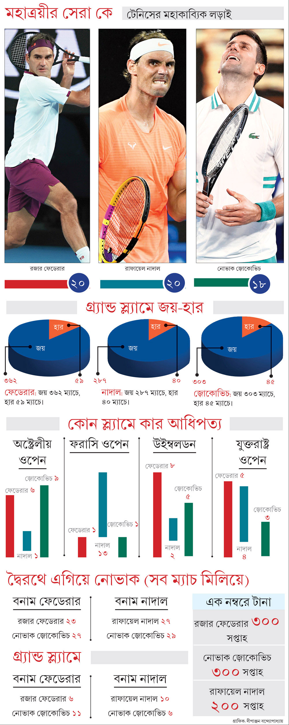 ২০০৩-এ উইম্বলডনে ফেডেরার যখন তাঁর প্রথম গ্র্যান্ড স্ল্যাম জিতছেন, জ়োকোভিচের বয়স ১৬। এখন তিনি টপকে যাওয়ার হুঙ্কার দিচ্ছেন কংবদন্তি রজারকে। ৩৯ বছরের ফেডেরারকে সম্প্রতি চোটের ধাক্কায় কোর্ট থেকে বাইরে থাকতে হয়েছে। ধরে নেওয়া যায়, প্রিয় ঘাসের কোর্ট উইম্বলডনে ফিরবেন রজার। কিন্তু আগের মতো ধারাবাহিক ভাবে শাসন করা তাঁর পক্ষে আর সম্ভব হবে না বলেই বিশেষজ্ঞরা মনে করছেন। নতুন করে সুস্থ হয়ে ফেরা নাদাল এবং জ়োকোভিচের মধ্যেই সব চেয়ে বেশি গ্র্যান্ড স্ল্যাম দখলের দৌড় সীমাবদ্ধ থাকতে পারে। নাদালের বয়স ৩৪, জ়োকোভিচের ৩৩। বয়স এবং ফর্ম জ়োকোভিচের দিকে। একটা সময় ছিল যখন টেনিসের ‘বিগ ফোর’ অর্থাৎ চার মহাতারকার কথা বলা হত। ফেডেরার, নাদাল, জ়োকোভিচের সঙ্গে সেই সময়ে দৌড়ে ছিলেন অ্যান্ডি মারে। কিন্তু চোট তাঁকে ছিটকে দিয়েছে। কিন্তু চলছে মহাত্রয়ীর শাসন।তরুণ প্রজন্মের মধ্যে কয়েক জন ছাপ ফেলছেন ঠিকই কিন্তু ধারাবাহিকতা দেখা যাচ্ছে না। যেমন দানিল মেদভেদেভ, স্টেফানোস চিচিপাস, ডমিনিক থিম, আলেকজান্ডার জ়েরেভ। প্রত্যেকেই প্রতিভাবান। চিচিপাস এ বারের অস্ট্রেলীয় ওপেনে নাদালকে হারিয়েছেন। মেদভেদেভ ফাইনাল খেলেছেন। কিন্তু গ্র্যান্ড স্ল্যাম খেতাব জয়ে এখনও রাজ চলছে মহাত্রয়ীর। গত ১৮ বছরে ৫৮টি গ্র্যান্ড স্ল্যাম জিতেছেন এই তিন জনে। গত ১১টি গ্র্যান্ড স্ল্যামের মধ্যে ১০টি জিতেছেন নাদাল ও জ়োকোভিচ। গত বছর যুক্তরাষ্ট্র ওপেন জেতেন ডমিনিক থিম। সাম্প্রতিককালে সেটাই একমাত্র নতুন মুখের জয়।