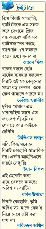 তার আটচল্লিশ ঘণ্টা কাটতে না কাটতে পরের ম্যাচেই হাতে সেলাই নিয়ে ব্যাট করতে নেমে পড়ল বিরাট। শুধু তাই নয়, স্বচ্ছন্দ একটা সেঞ্চুরি করে টিমকে শেষ চারের পাকা জায়গা প্রায় পাইয়ে দিল। মনে হচ্ছে বিরাট জীবনের সেরা ফর্মে রয়েছে। কিন্তু তার চেয়েও বেশি আমার যেটা চোখে পড়ে, সেটা হল ওর জেতার ইচ্ছে। এই ইচ্ছেটা এত ছোঁয়াচে যে গোটা টিম অধিনায়কের সঙ্গে রয়েছে।