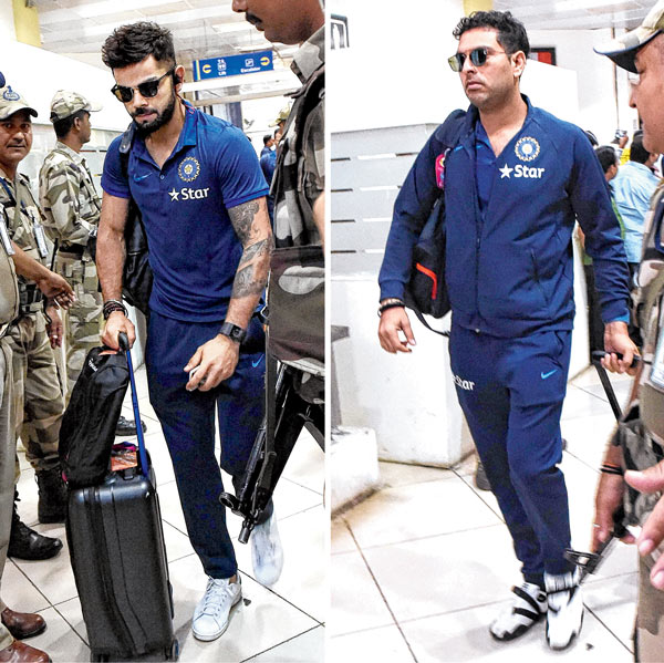 মেগাম্যাচ খেলতে শহরে চলে এলেন কোহালি-যুবরাজরা। বুধবার কলকাতা বিমানবন্দরে।-উৎপল সরকার