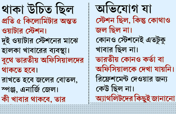 ‘‘ওখানে প্রচণ্ড গরম ছিল। সকাল ন’টায় ম্যারাথন শুরু হয়েছিল। প্রচণ্ড রোদের মধ্যে দৌড়তে হচ্ছিল,’’ দেশে ফিরে বলেছেন জৈশা। মেয়েদের ম্যারাথনে যিনি ৮৯ নম্বরে শেষ করেন। তাঁর আরও অভিযোগ, ‘‘ওই অবস্থাতেও আমাদের জন্য জলের কোনও ব্যবস্থা ছিল না। রিকভারি ড্রিঙ্কস বা খাবারও নয়। অলিম্পিক্স সংগঠক কমিটি আট কিলোমিটার অন্তর জল দিচ্ছিল, কিন্তু তাতে কোনও উপকারই হয়নি। দু’কিলোমিটার অন্তর প্রতিটা দেশের স্টল ছিল। আমাদের স্টলগুলো সব খালি পড়ে ছিল।’’