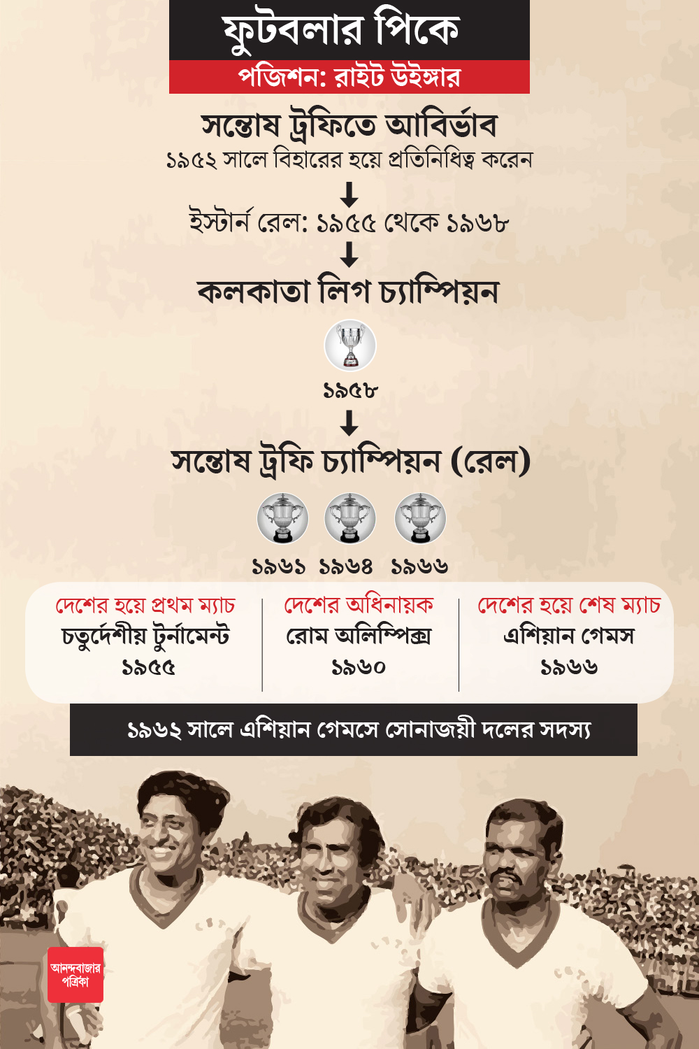 তাঁর অনবদ্য ফুটবল স্কিল আর ক্ষুরধার মস্তিষ্কে ভর করে দেশ-বিদেশের মাঠে দাপিয়ে বেরিয়েছে ভারতীয় ফুটবল। শাসন করেছে এশিয়ান গেমস। অলিম্পিক্সের মতো আসরে ফ্রান্সের মতো মহাশক্তিধর দেশের সঙ্গে ড্র করেছে। তিনি পিকে বন্দ্যোপাধ্যায়।