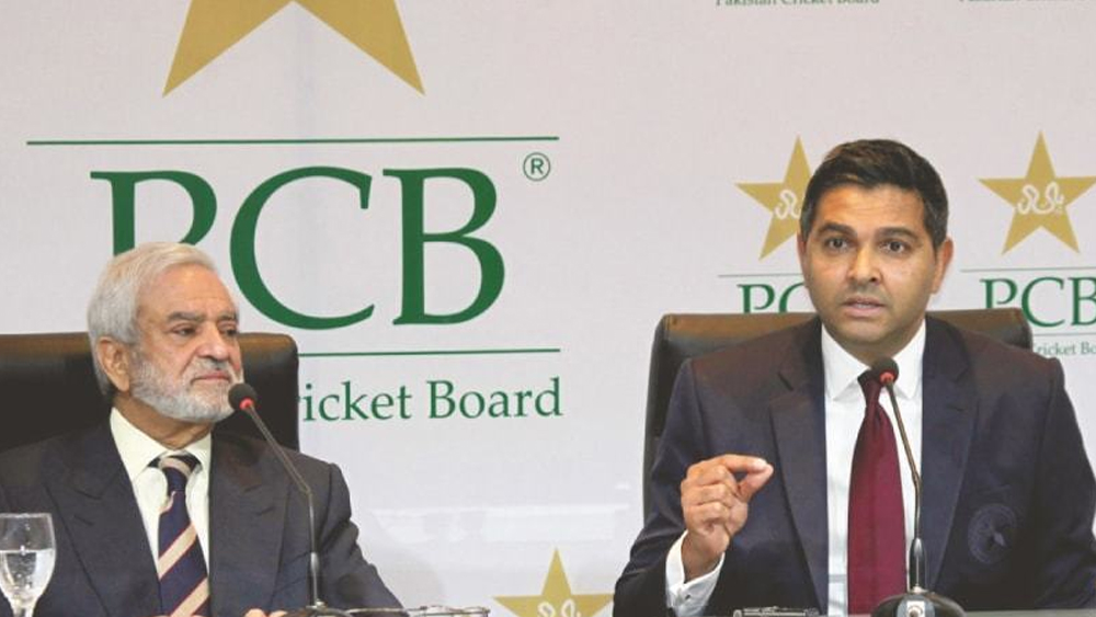 পিসিবি চেয়ারম্যান এহসান মানির সঙ্গে প্রচারমাধ্যমের মুখোমুখি ওয়াসিম খান। —ফাইল চিত্র।