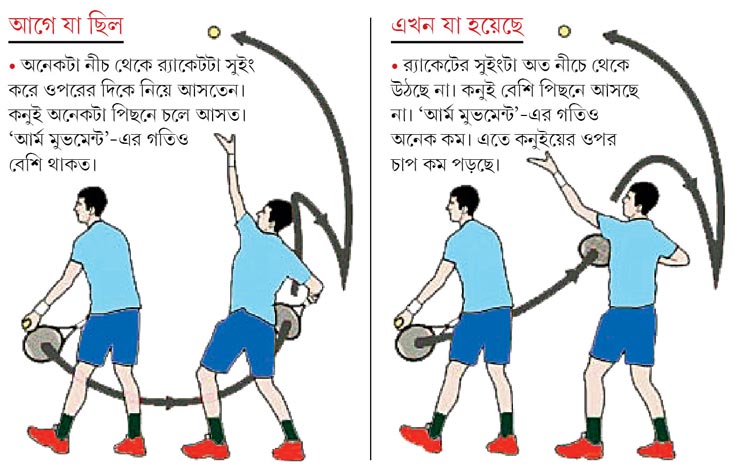 বলটা শূন্যে ছুড়ে দিয়ে কনুইটা পিছনে টেনে আনলেন। তার পর ডান হাতটা উপরে তুলে সার্ভ করলেন। আর তখনই বোঝা গেল পরিবর্তনটা। কনুইটা আর আগের মতো অত পিছনে টেনে আনছেন না। ‘আর্ম মুভমেন্ট’-এর গতিও কমে গিয়েছে অনেকটা। চট করে দেখলে মনে হবে, স্লো মোশনে সার্ভ করছেন।