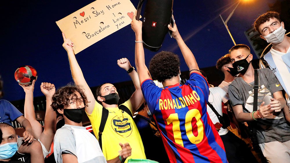 প্রতিবাদ: মেসিকে রাখার জন্য সরব ভক্তরা। ক্লাবের সামনে। ছবি: রয়টার্স।