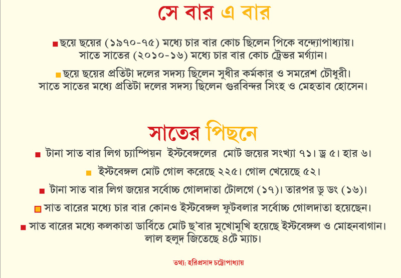 এটা ঘটনা যে ডার্বির ভয়ঙ্কর চাপটা এ বার নিতে হয়নি ইস্টবেঙ্গলকে। ওই ম্যাচ না খেলেই পয়েন্ট পেয়ে যাওয়ায় মেহতাবদের উপর খেতাব জেতার চাপটা অনেক কমে গিয়েছিল। এটাই টার্নিং পয়েন্ট হয়ে গেল এ বারের লিগের। তবুও বলব, নতুন ইতিহাস তৈরি হল। তৈরি হল কলকাতা লিগের নতুন মাইলস্টোনও। অপেক্ষায় থাকব কবে এটা ভাঙে।