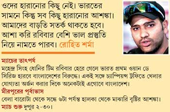 ভাল। কিন্তু টিম ম্যানেজমেন্টের কয়েকটা ব্যাপার নিয়ে তো প্রশ্ন থাকছে। মহেন্দ্র সিংহ ধোনি ব্যাটিং অর্ডারে কেন আরও উপরে আসছেন না, উত্তর নেই। শাস্ত্রী নিজেও তাঁকে কিছু এ নিয়ে বলছেন না। আর পিচ চরিত্র নিয়ে বাংলাদেশ সাংবাদিককুলের বক্তব্য যদি সত্যি হয়, তা হলে স্ট্র্যাটেজিটাও অদ্ভুত। মীরপুরের এই পাঁচ নম্বর পিচ নাকি পাকিস্তানকে কাঁদিয়ে ছেড়েছিল। বলা হচ্ছে এর গতি গত বৃহস্পতিবারেরটার চেয়েও বেশি। বাংলাদেশ চার পেসারে যাচ্ছেই যাচ্ছে।