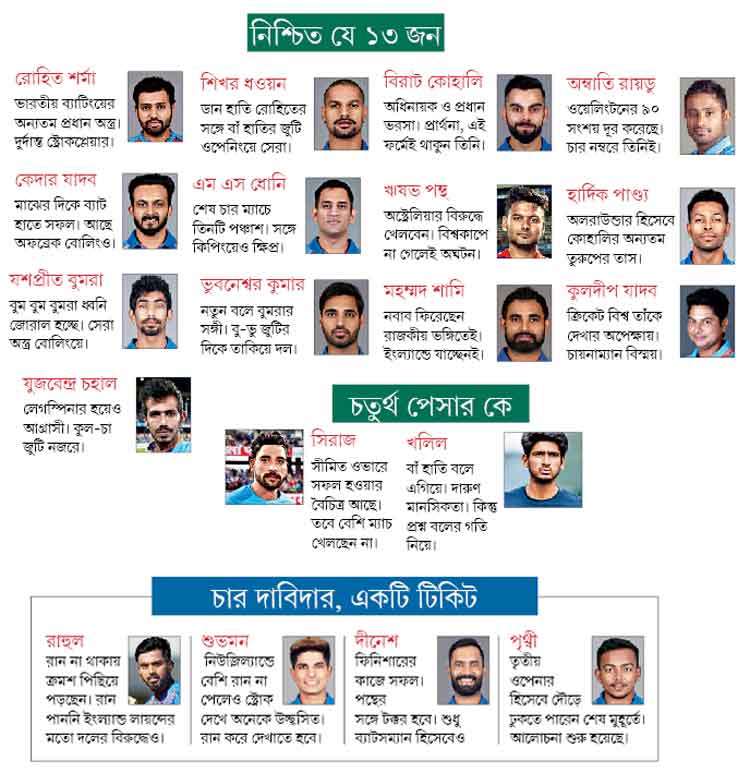 বিশ্বকাপে দল নির্বাচনী নকশা মোটামুটি তৈরি করে ফেলা হয়েছে। ছয় ব্যাটসম্যান, দুই উইকেটকিপার, এক অলরাউন্ডার, চার পেসার এবং দুই স্পিনার— এই হবে পনেরো জন বাছার ফর্মুলা। বিভিন্ন সূত্র থেকে পাওয়া ইঙ্গিত অনুযায়ী, যে ১৩ জনের আসন কার্যত পাকা বলে জানা গিয়েছে, সেই নামগুলি এ রকম: রোহিত শর্মা, শিখর ধওয়ন, বিরাট কোহালি, অম্বাতি রায়ডু, কেদার যাদব, মহেন্দ্র সিংহ ধোনি, ঋষভ পন্থ, হার্দিক পাণ্ড্য, যশপ্রীত বুমরা, ভুবনেশ্বর কুমার, মহম্মদ শামি, কুলদীপ যাদব এবং যুজবেন্দ্র চহাল।