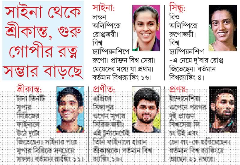 গোপীচন্দ: অবশ্যই। পুরুষদের বিভাগেও এ বার ভারতীয় ব্যাডমিন্টনে সোনার দিন আসছে। অনেক ভাল ভাল খেলোয়াড় উঠে এসেছে। শ্রীকান্ত তো আছেই, কাশ্যপ, প্রণয়, সাই প্রণীত। এরা প্রত্যেকেই বেশ ভাল এবং বিশ্বমানের টুর্নামেন্ট জেতার ক্ষমতা রাখে।
