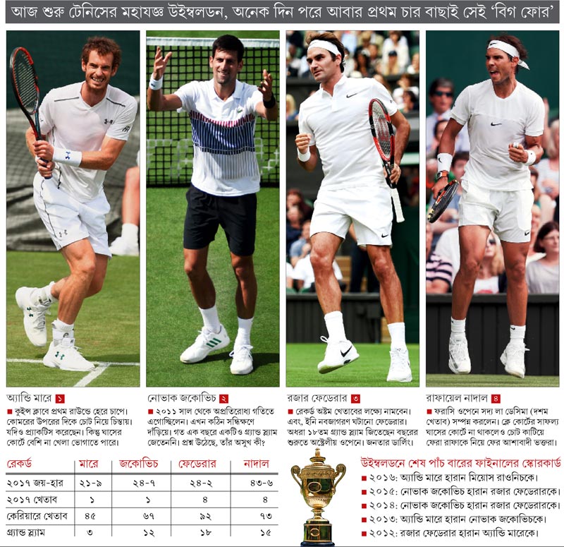 উইম্বলডনে এ বার আমার বাজিও কিন্তু রাফায়েল নাদাল। বহু দিন পরে নাদালকে আবার সেই বিধ্বংসী ফর্মে দেখছি। অনেক আগ্রাসী খেলছে। অনেক বেশি নেটের সামনে আসছে। ফরাসি ওপেনে নাদালকে যে রকম ফর্মে দেখেছি, সেটা ঘাসের কোর্টে ধরে রাখতে পারলে ও-ই কিন্তু দৌড়ে এগিয়ে থাকবে। উইম্বলডনে নাদাল দু’বারের চ্যাম্পিয়ন। আরও একটা তথ্যও কিন্তু নাদালের পক্ষে যাচ্ছে। উইম্বলডনে নাদাল যে দু’বার চ্যাম্পিয়ন হয়েছে, (২০০৮ এবং ২০১০) সেই দু’বারই ফরাসি ওপেনে এ বারের মতো বিধ্বংসী ফর্মে ছিল।
