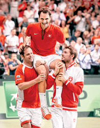 প্রায় দু’দশকের কেরিয়ারে শুধু ডেভিস কাপটাই যা হাতে তুলতে পারেননি রজার ফেডেরার। রবিবার সুইৎজারল্যান্ডকে ডেভিস কাপের ফাইনালে তুলে সেই লক্ষ্যে আরও এক ধাপ এগোলেন ১৭ গ্র্যান্ড স্ল্যামের মালিক। ইতালির বিরুদ্ধে প্রথম দু’টি সিঙ্গলসে জেতেন ফেডেরার আর ওয়ারিঙ্কা। কিন্তু ডাবলসে বোলেলি-ফজনিনি জুটির কাছে ওয়ারিঙ্কা-মার্কো চিউডিনেল্লির হারায় বিপদে পড়ে সুইৎজারল্যান্ড। ফাইনালে যেতে হলে ফেডেরারকে জিততেই হত। ফাবিও ফজনিনির বিরুদ্ধে সেই কাজটাই করে দেখান সুইস মহাতারকা। ৬-২, ৬-৩, ৭-৬ (৪) জিতে সুইৎজারল্যান্ডকে ৩-১ এগিয়ে দেন। নভেম্বরে ফাইনালে লড়াই ফ্রান্সের বিরুদ্ধে।
