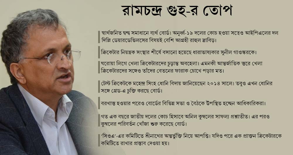 ডামাডোল অব্যাহত ভারতীয় ক্রিকেট বোর্ডের অন্দরমহলে। কোহালি-কুম্বলে দ্বন্দ্বের মধ্যেই এ বার ভারতীয় বোর্ডের অস্বস্তি বাড়ালেন সুপ্রিম কোর্ট নিযুক্ত কমিটির সদ্য প্রাক্তন সদস্য ঐতিহাসিক রামচন্দ্র গুহ। বৃহস্পতিবার হঠাৎ করেই সুপ্রিম কোর্টের তৈরি করা প্রশাসনিক কমিটি থেকে ইস্তফা দেন রামচন্দ্র। গতকালই বিনোদ রাইকে ইস্তফাপত্র পাঠিয়ে দেন রামচন্দ্র। এ দিন প্রকাশ্যে এল সেই চিঠি। চিঠিতে ধোনি থেকে গওস্কর, দ্রাবিড় থেকে শ্রীনাথ সবাইকে নিয়েই প্রশ্ন তোলেন এই ঐতিহাসিক। শুধু তাই নয় এ বিষয় বিসিসিআইয়ের সদর্থক ভূমিকা নিয়েও প্রশ্ন তোলেন তিনি।