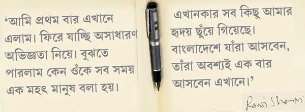 ‘আমি প্রথম বার এখানে এলাম। ফিরে যাচ্ছি অসাধারণ অভিজ্ঞতা নিয়ে। বুঝতে পারলাম কেন ওঁকে সব সময় এক মহত্ মানুষ বলা হয়। এখানকার সব কিছু আমার হৃদয় ছুঁয়ে গিয়েছে। বাংলাদেশে যাঁরা আসবেন, তাঁরা অবশ্যই এক বার আসবেন এখানে।’