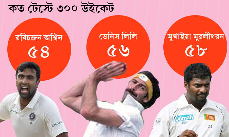 ৩৬ বছর পর লিলির রেকর্ড ভাঙলেন অশ্বিন। ৫৪টি টেস্টে ৭৫২০ রান খরচ করে ৩০০ উইকেট শিকারির তালিকায় নাম তুললেন।