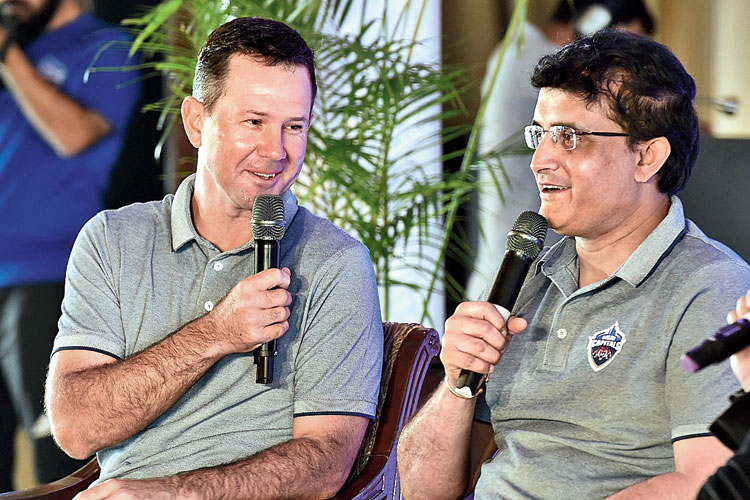 জুটি: এক সময় ছিলেন প্রতিপক্ষ। এ বার দিল্লি ক্যাপিটালসে হেড কোচ ও উপদেষ্টা। মঙ্গলবার সাংবাদিক বৈঠকে পন্টিং ও সৌরভ। নয়াদিল্লিতে। ছবি: এএফপি