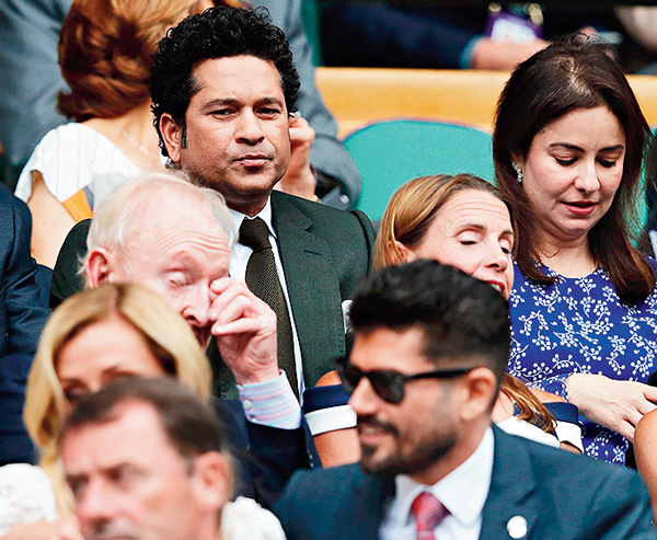 অতিথি: ফেডেরার শো দেখতে উইম্বলডনে সস্ত্রীক সচিন। ছবি: এএফপি