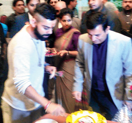 ভারতে পাঁচশোতম টেস্টের জন্য হোটেলে বিশেষ কেক কাটলেন বিরাট কোহালি। শনিবার কানপুরে। ছবি: টুইটার।