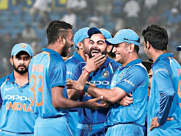 অপ্রতিরোধ্য: অস্ট্রেলিয়াকে ওয়ান ডে সিরিজে ৪-১ হারিয়ে কোহালি, ধোনিরা। রবিবার নাগপুরে। ছবি: পিটিআই।