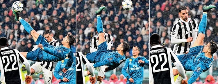 অবিশ্বাস্য: ডান দিক থেকে ভেসে আসা কার্ভাহালের ক্রসে শূন্যে ভাসমান অবস্থায় পা ছোঁয়ালেন রোনাল্ডো (বামদিকে)। নয় ফুটেরও বেশি উচ্চতা থেকে সেই স্বপ্নের বাইসাইকেল কিক (মাঝখানে)। রোনাল্ডো মাটি ছোঁয়ার আগেই বল জড়িয়ে যায় জুভেন্তাসের জালে (ডানদিকে)। ছবি: এএফপি