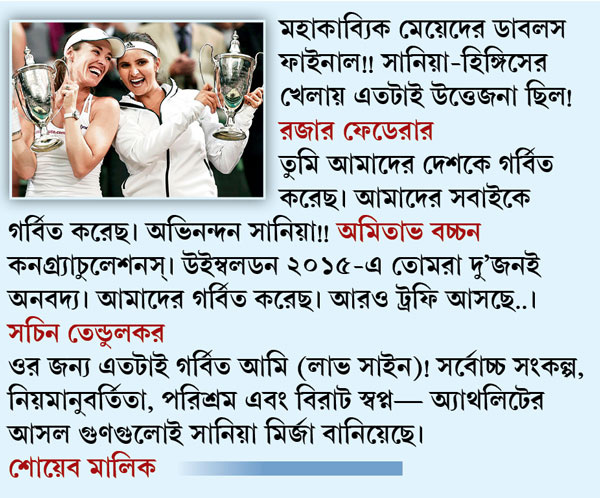 সানিয়া উইম্বলডন ডাবলস চ্যাম্পিয়ন হয়ে ১ কোটি ৬৭ লাখ টাকা পাচ্ছে। কিন্তু আমরা দু’জনেই একমত— এত টাকার চেয়েও বেশি হল প্রেস্টিজ। উইম্বলডন চ্যাম্পিয়ন হিসেবে শনিবারের পর থেকে আজীবন যেটা পাবে ও। আমি তো বলব, সানিয়ার উইম্বলডন জেতাটা ভারতীয় খেলাধুলোর ইতিহাসেই এক বিরাট ঘটনা।