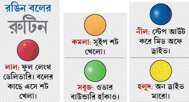 লাল মানে, ফুল লেংথ ডেলিভারি আসবে। যেটার কাছে এসে শট খেলা প্র্যাকটিস করতে হবে।
