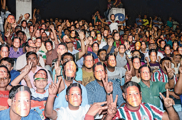 হোক না সেগুলো মুখোশ। কিন্তু তার আড়ালে মিলিত যে শব্দব্রহ্ম পুরো নব্বই মিনিট কার্যকর ছিল, সেটা খালিদ জামিলের মুম্বই দলের উপর চাপ বাড়াতে কম ছিল না। প্রায় দশ হাজার মোহনবাগান সমর্থক তাঁদের প্রিয় দলের কোচ সঞ্জয়ের মুখোশ পরে এ দিন সবুজ-মেরুনের আই লিগ ম্যাচ দেখতে হাজির ছিলেন মাঠে। সঞ্জয়ের প্রতি ফেডারেশনের ‘অন্যায়’ শাস্তির প্রতিবাদে। ভারতীয় ফুটবলে যা নজিরবিহীন। আর সেটাই খেলার শুরু থেকেই স্পষ্ট তাতিয়ে তুলেছিল বাগান ফুটবলারদের। ফলও পাওয়া গিয়েছে হাতেনাতেই। মুম্বই এফসিকে দু’অর্ধের দু’গোলে হারিয়ে শুধু আই লিগে শীর্ষস্থান ধরে রাখাই নয়, ১১ ম্যাচের পর লিগ টেবলে সবচেয়ে কাছে থাকা বেঙ্গালুরু এফসি (৩) আর ইস্টবেঙ্গলের (৫) থেকে পয়েন্টের ব্যবধানও বাড়িয়ে রাখল সনি-কাতসুমিদের বাগান। ম্যাচের পর সতর্ক সনি অবশ্য বললেন, ‘‘আরও তিনটে ম্যাচ জিততে হবে।’’ আর কোচ সঞ্জয়ের দাবি, ‘‘আমাদের বাকি পাঁচটা ম্যাচের চারটে জিতলে বলতে পারব, চ্যাম্পিয়ন হচ্ছি।’’