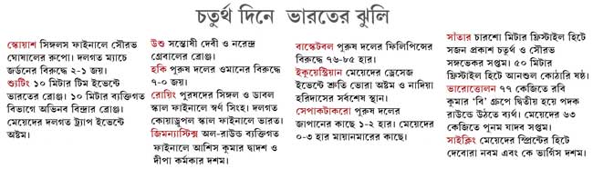 তাইওয়ানিজ ভারোত্তোলকের জোড়া বিশ্বরেকর্ড। এ বারের গেমসে প্রথম ডোপ-কেলেঙ্কারি (এক কাজাখ ফুটবলার পরীক্ষায় ধরা পড়েছেন)। হকিতে সর্দার সিংহের দলের দ্বিতীয় বড় জয় (গ্রুপে ওমানকে আজ ৭-০ হারিয়েছে) সত্ত্বেও দলের এক নম্বর ড্র্যাগ-ফ্লিকার রুপিন্দর পাল সিংহ চোট পাওয়ায় গুরুত্বপূর্ণ পাকিস্তান ম্যাচের আগে শঙ্কায় ভারত। পদক ফেভারিট ভারতীয় ভারোত্তোলকের (৭৭ কেজিতে সতীশ কুমার) প্রচণ্ড জ্বরে লড়াইয়েই নামতে না পারা নানা আলো-অন্ধকারের কোলাজের মধ্যে অলিম্পিক সোনাজয়ী এক ভারতীয় শু্যটারের ভবিষ্যৎ নিয়ে এশিয়াডের প্রচারমাধ্যম ব্যস্ত থাকল। অভিনব বিন্দ্রা চব্বিশ ঘণ্টা আগে ইনচিওন-উত্তর অবসর নেবেন জানালেও এ দিন একশো আশি ডিগ্রি ঘুরে বলে দেন, “ কে বলল আমি অবসর নিচ্ছি? তবে এখনও পরের আন্তর্জাতিক টুর্নামেন্ট নিয়ে ভাবিনি। যদিও রিও অলিম্পিক মাথায় আছে।”