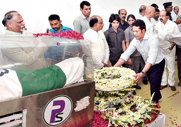 প্রয়াত প্রাক্তন রাষ্ট্রপতি এ পি জে আব্দুল কালামকে শেষ শ্রদ্ধা সচিন তেন্ডুলকরের। নয়াদিল্লিতে। ছবি: পিটিআই।
