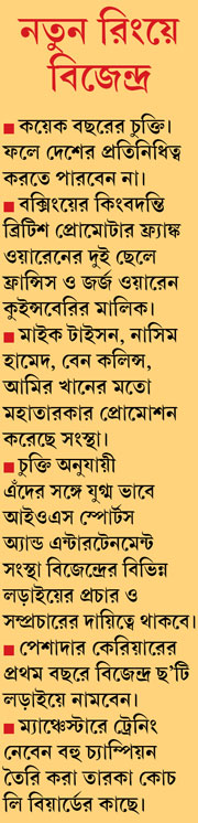ভারতীয় বক্সিংয়ের মহাতারকা যে জাতীয় জার্সিতে আর প্রতিযোগিতায় নামবেন না, সেই খবরটা ছড়িয়ে পড়েছিল আগেই। এ দিন লন্ডনে কুইন্সবেরি প্রোমোশনস-এর সঙ্গে চুক্তি সই করার পর পাকাপাকি পেশাদারি বক্সিংয়ে চলে গেলেন অলিম্পিকের মঞ্চ থেকে দেশকে বক্সিংয়ের ব্রোঞ্জ এনে দিয়ে ইতিহাস গড়া বিজেন্দ্র।