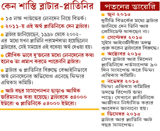 শুক্রবার শেষ বারের জন্য শুনানিতে নিজেকে ‘নির্দোষ’ বলে দাবি করেছিলেন ব্লাটার। কিছু দিন আগেও কোর্ট অব আর্বিট্রেশনে আবেদন জানিয়েছিলেন প্লাতিনি। শেষরক্ষা হল না কারও। খুব বেশি সময় না নিয়ে ফিফা এথিকস কমিটি জানিয়ে দিল ব্লাটারের থেকে নেওয়া ১৩ লক্ষ পাউন্ডের কোনও লিখিত হিসেব নেই। ফিফার নীতির বিরুদ্ধে এই অর্থ দেওয়া হয়েছিল। আর তাতেই অবসান ঘটল ফুটবলের দুই শক্তিশালী চরিত্রের।