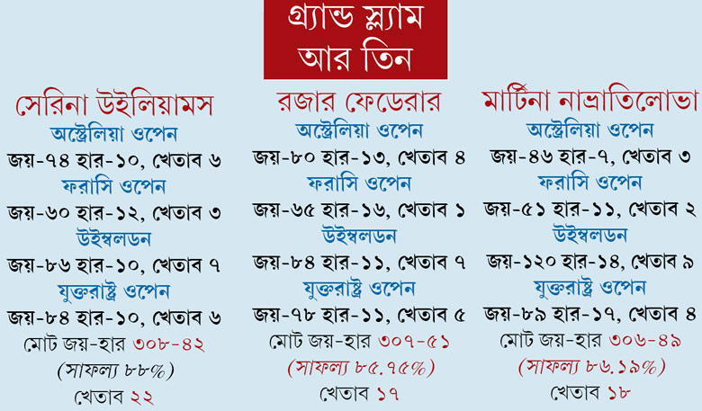সেরিনার সব মিলিয়ে গ্র্যান্ড স্ল্যাম ম্যাচ জয়ের সংখ্যা আপাতত ৩০৮। গত রাতের পরে এই তালিকায় তাঁর পরে দ্বিতীয় স্থানে রজার ফেডেরার (৩০৭), তিনে মার্টিনা নাভ্রাতিলোভা (৩০৬)। অর্থাৎ, পরের জানুয়ারিতে অস্ট্রেলিয়া ওপেন থেকে চলবে রজার-সেরিনার একে অন্যকে টপকে যাওয়ার দৌড়। তবে আপাতত ‘সেরিনাময়’ বিশ্ব টেনিস। একটা বিশ্বরেকর্ডের পরে চলতি সপ্তাহান্তে সেরিনার আর একটা বিশ্বরেকর্ডের আশায় অপেক্ষমান তাঁর ভক্তকুল। ওপেন যুগে স্টেফি গ্রাফের সর্বাধিক গ্র্যান্ড স্ল্যাম খেতাবের (২২) রেকর্ড ভেঙে সেরিনার ২৩ করা!