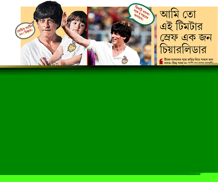 সঙ্গে সঙ্গে হাজারো ক্যামেরার ফ্ল্যাশ, তাঁর দিকে অজস্র মানুষের হাতছানি, কানায় কানায় ভরা ইডেন জুড়ে ‘শাহরুখ...শাহরুখ’ প্রতিধ্বনি। ম্যাচ শেষেও যে উত্তেজনা শেষ হয়নি। শাহরুখ তাঁর প্রায় কোমর-সমান ছোট ছেলেকে নিয়ে গোটা মাঠ ঘুরেছেন আর মধ্যরাত পেরোতে চলা ইডেনের ভিড় হুমড়ি খেয়ে পড়েছে পিতা-পুত্রকে আর একটু কাছ থেকে দেখার জন্য।