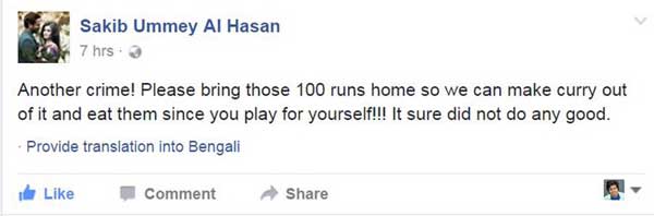 সাকিব ব্যাট হাতে জবাব দিলেও মুখে কিছু বলেননি। কিন্তু চুপ থাকলেন না তাঁর স্ত্রী শিশির। সাকিব তাঁর কেরিয়ারের পঞ্চম সেঞ্চুরি তুলে নেওয়ার পর শিশির ফেসবুকে নিন্দুকদের এক হাত নিলেন। কিছুটা ক্ষোভ মিশ্রিত আবেগে স্বামীকে উদ্দেশ্য করে শিশির লেখেন, ‘নিঃসন্দেহে এই সেঞ্চুরি কোনও কাজেই আসেনি!’ এটুকুই নয়, ব্যঙ্গের সুর চড়িয়ে শিশির বলেন, ‘আবার একটা অপরাধ করে ফেললে! প্লিজ ওই সেঞ্চুরিটাকে বাড়িতে সঙ্গে নিয়ে এসো যাতে ওটা দিয়ে আমরা তরকারি রান্না করে ফেলতে পারি এবং খেয়ে যেতে পারি, যত দিন তুমি শুধু নিজের জন্য খেলে যাবে তত দিন পর্যন্ত।’